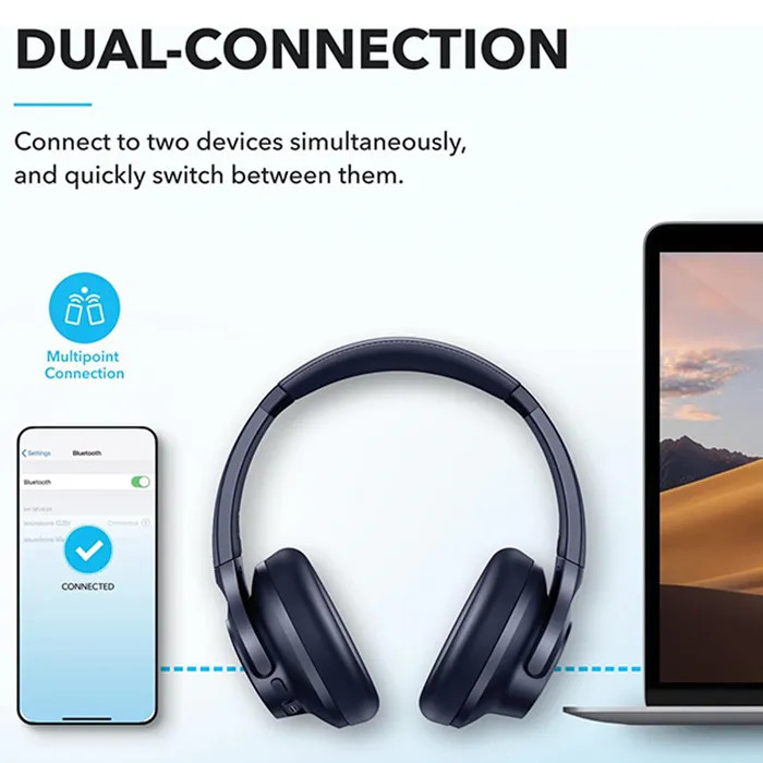هدفون Soundcore Q20i با یک بار شارژ کامل میتواند تا 60 ساعت (در صورت خاموش بودن قابلیت حذف نویز) یا تا 40 ساعت (در صورت روشن بودن قابلیت حذف نویز) پخش موسیقی را پشتیبانی کند. این محصول، از طریق بلوتوث 5.0 به دستگاه شما متصل میشود و تا 10 متر برد اتصال دارد.